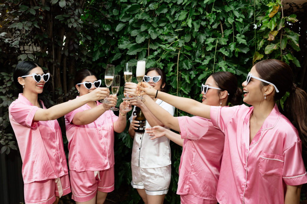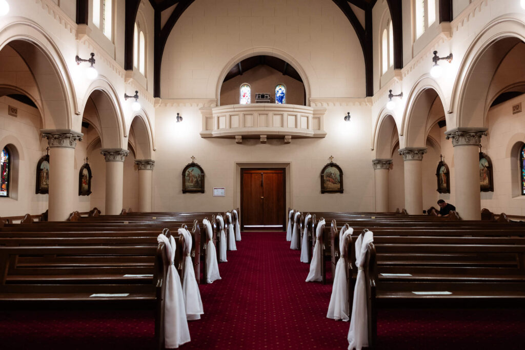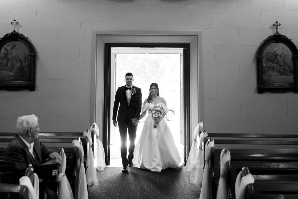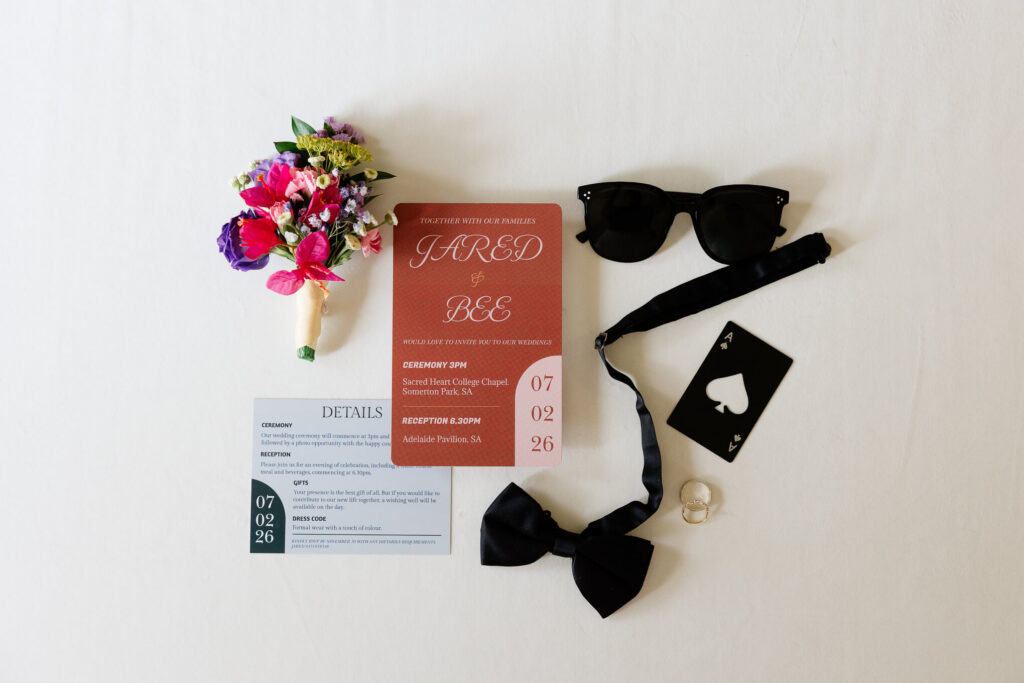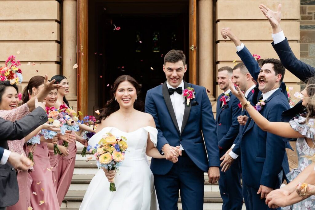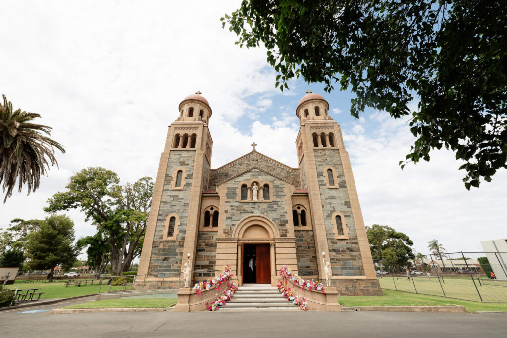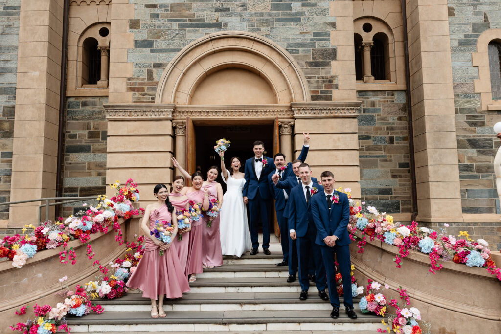Bee and Jared celebrated their wedding with a day full of joyful and heartfelt moments, starting at Sacred Heart College Chapel. The morning included a champagne pop with the girls during prep and a sweet first look outside the chapel before the ceremony. In a special touch, Bee and Jared walked down the aisle together, surrounded by family and friends.