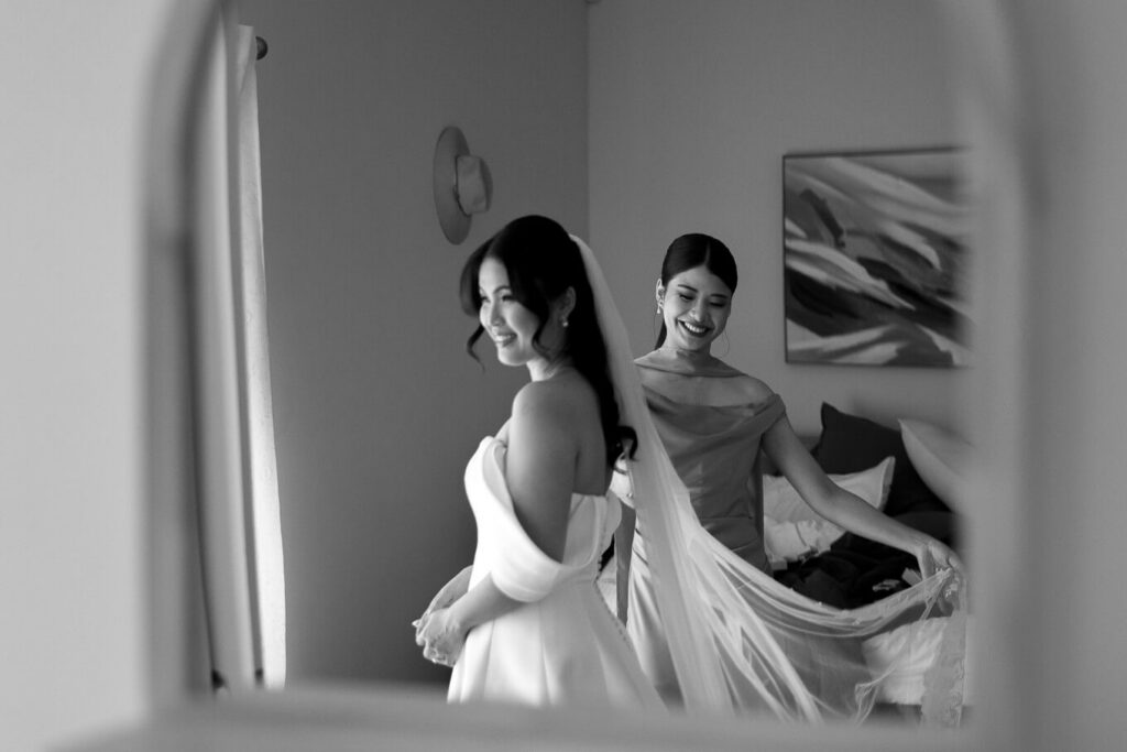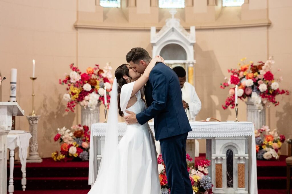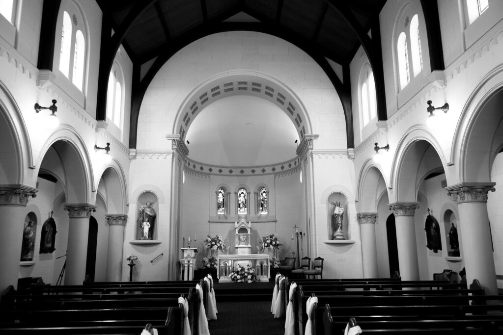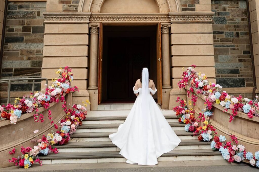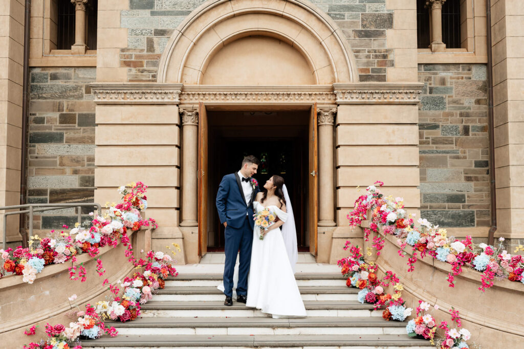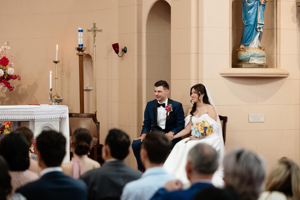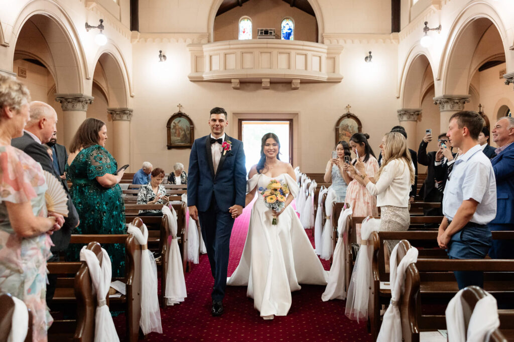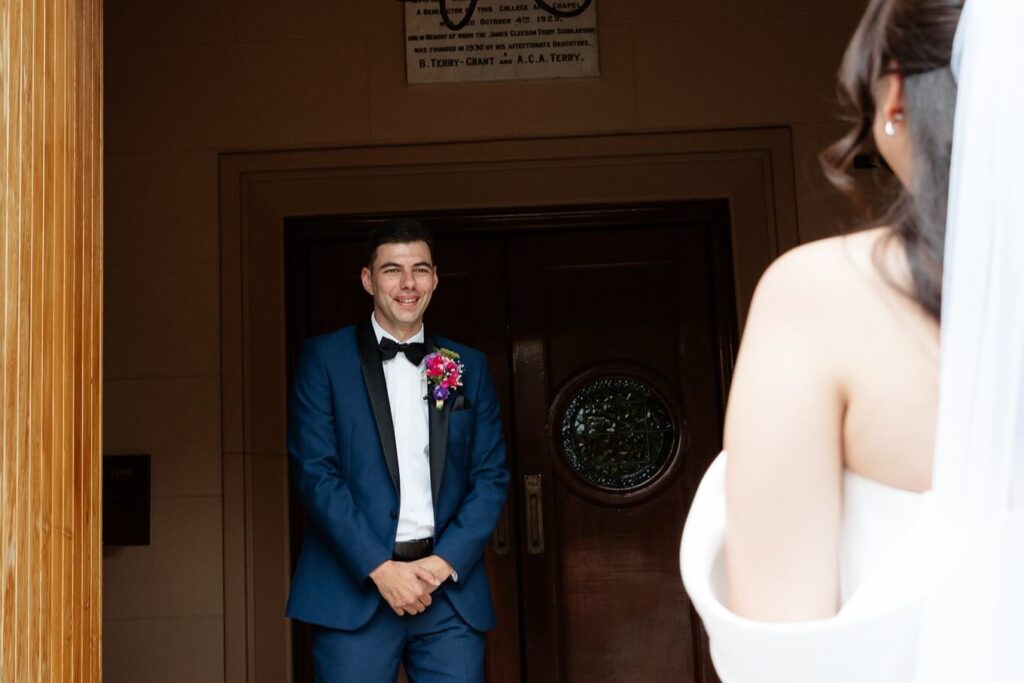 Bee and Jared celebrated their wedding with a day full of joyful and heartfelt moments, starting at Sacred Heart College Chapel. The morning included a champagne pop with the girls during prep and a sweet first look outside the chapel before the ceremony. In a special touch, Bee and Jared walked down the aisle together, surrounded by family and friends.