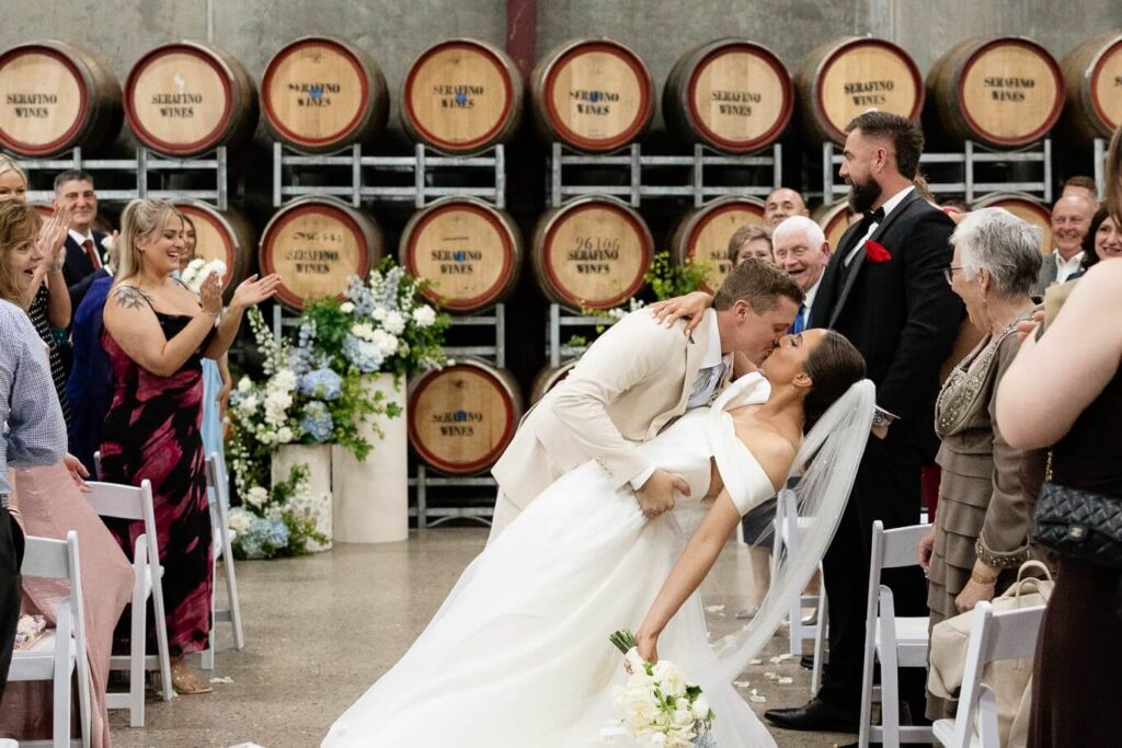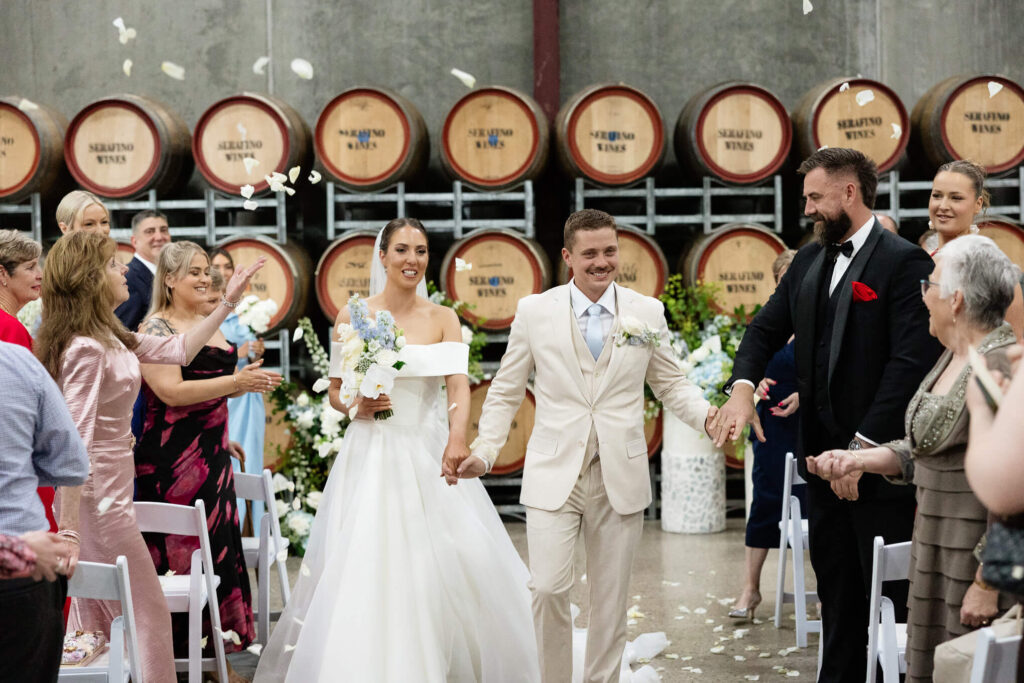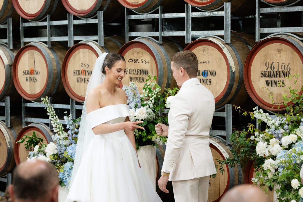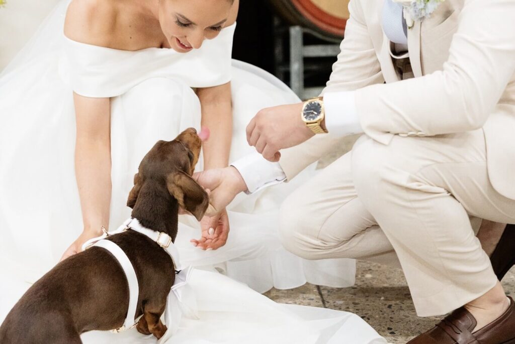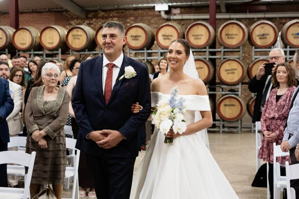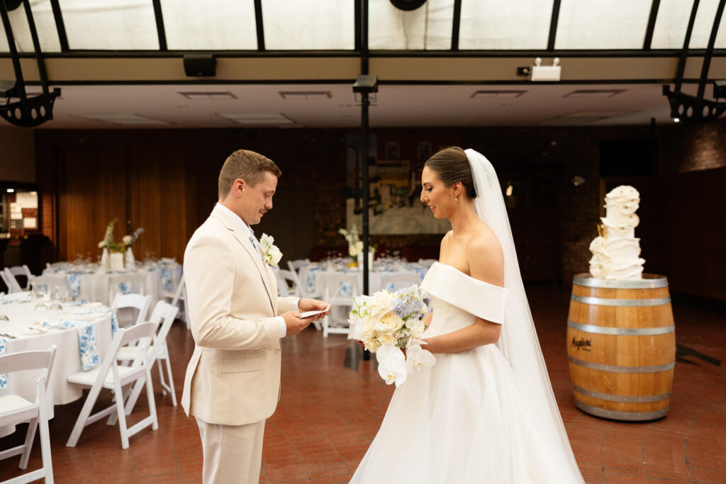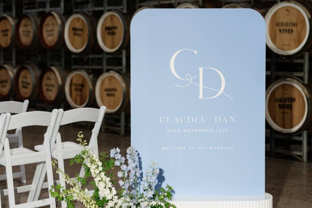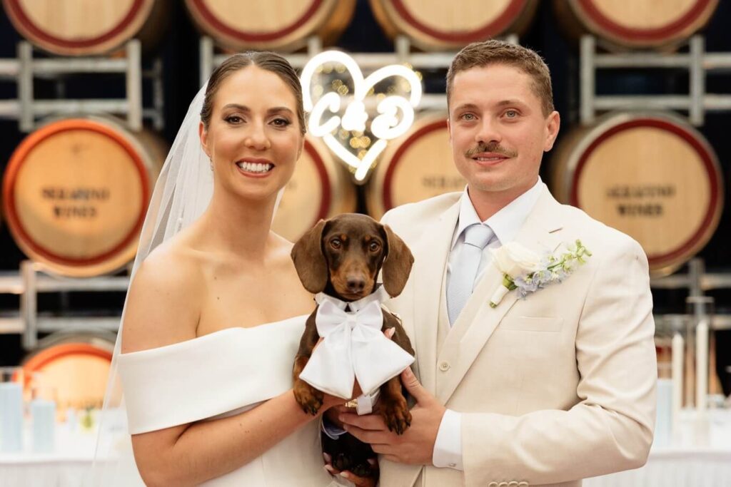 Claudia and Dan celebrated their wedding at Serafino Wines with a day full of personal touches and meaning. The morning began with a series of first looks — Claudia shared a special moment with her father, followed by her bridesmaids, and then Dan. The couple also exchanged letters and gifts before the ceremony, setting a heartfelt tone. Reggie, their dog, made his own entrance down the aisle after the bride, much to everyone’s delight.