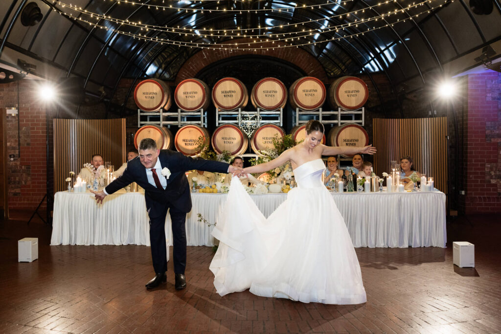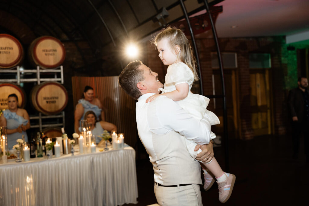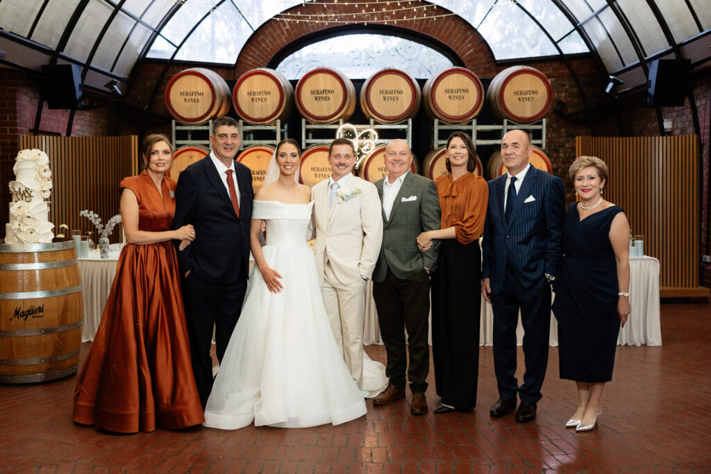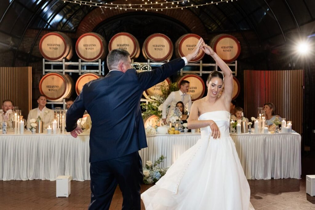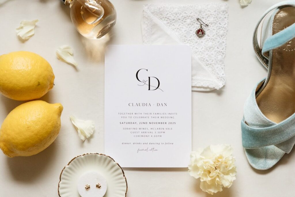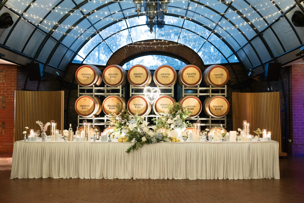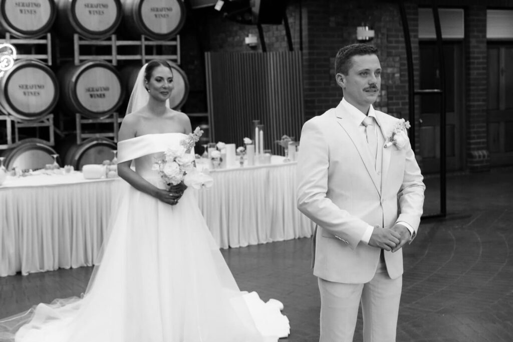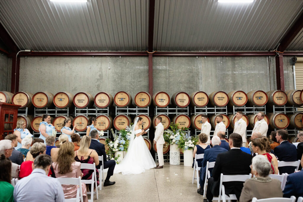 Claudia and Dan celebrated their wedding at Serafino Wines with a day full of personal touches and meaning. The morning began with a series of first looks — Claudia shared a special moment with her father, followed by her bridesmaids, and then Dan. The couple also exchanged letters and gifts before the ceremony, setting a heartfelt tone. Reggie, their dog, made his own entrance down the aisle after the bride, much to everyone’s delight.