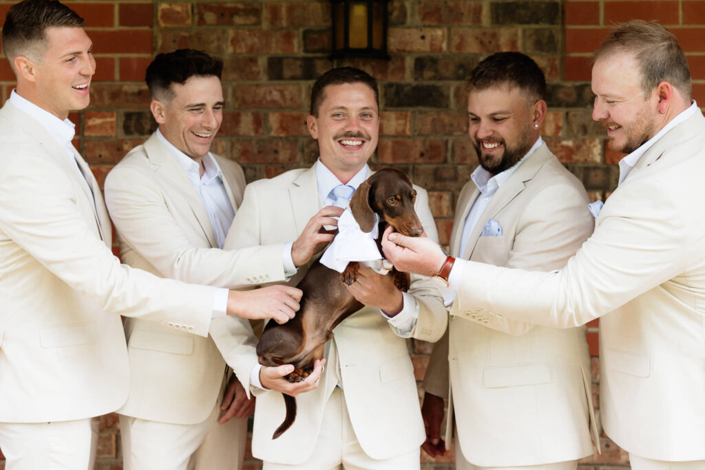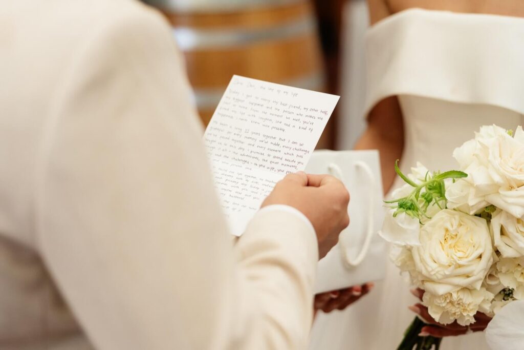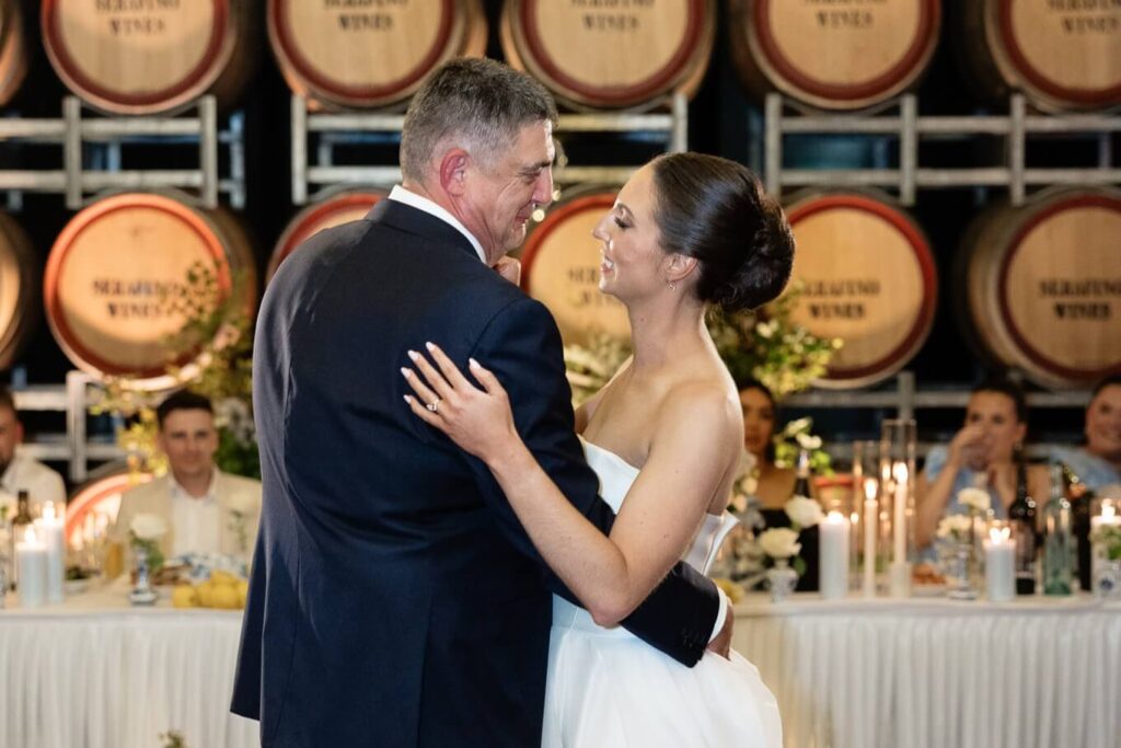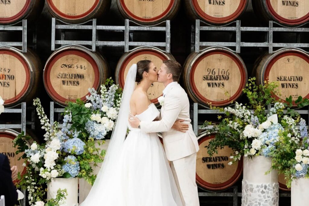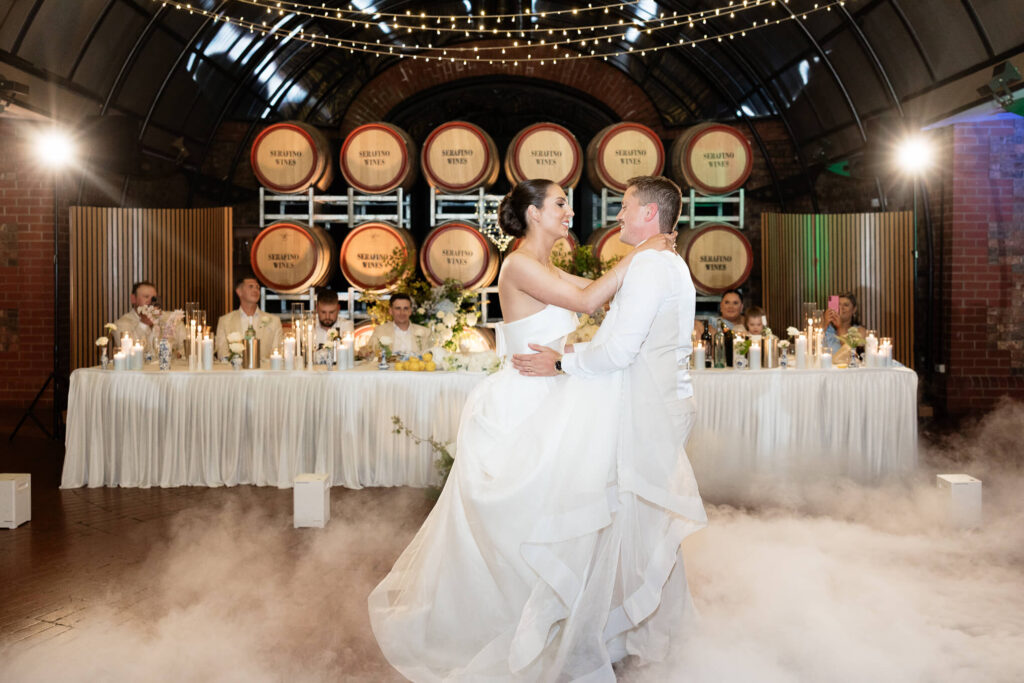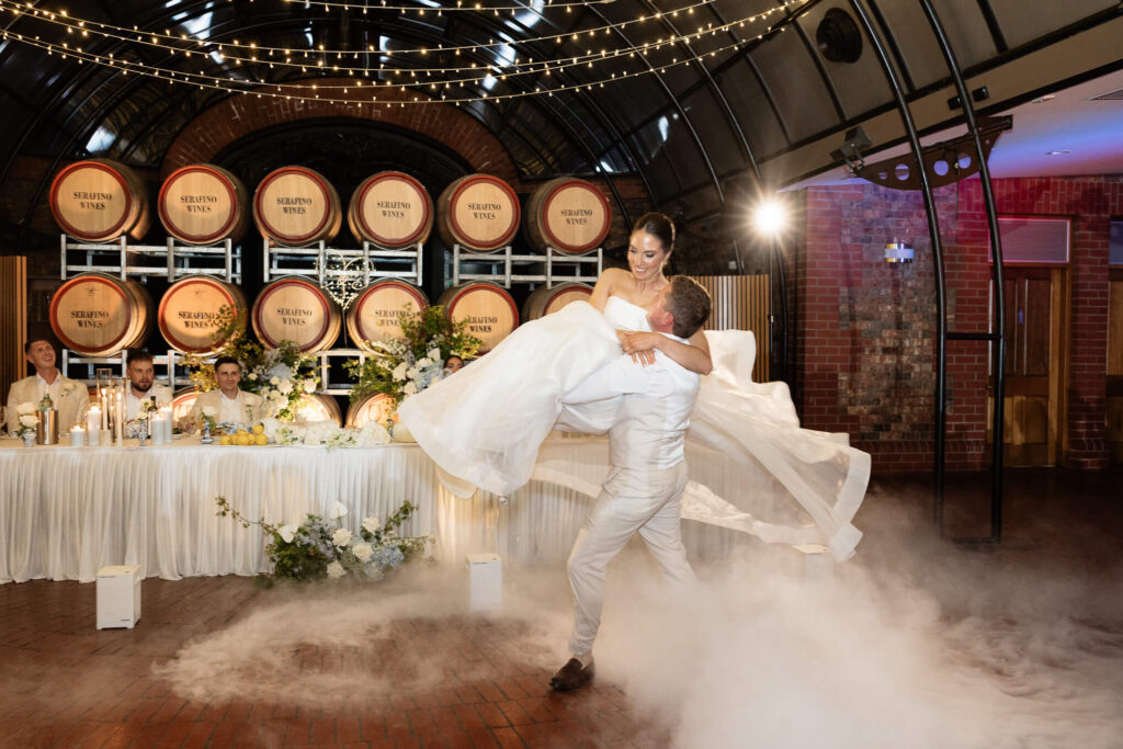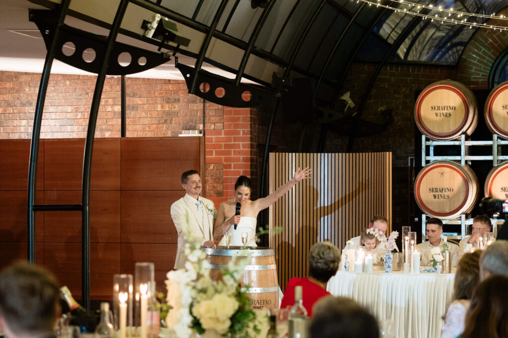 Claudia and Dan celebrated their wedding at Serafino Wines with a day full of personal touches and meaning. The morning began with a series of first looks — Claudia shared a special moment with her father, followed by her bridesmaids, and then Dan. The couple also exchanged letters and gifts before the ceremony, setting a heartfelt tone. Reggie, their dog, made his own entrance down the aisle after the bride, much to everyone’s delight.