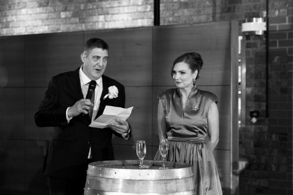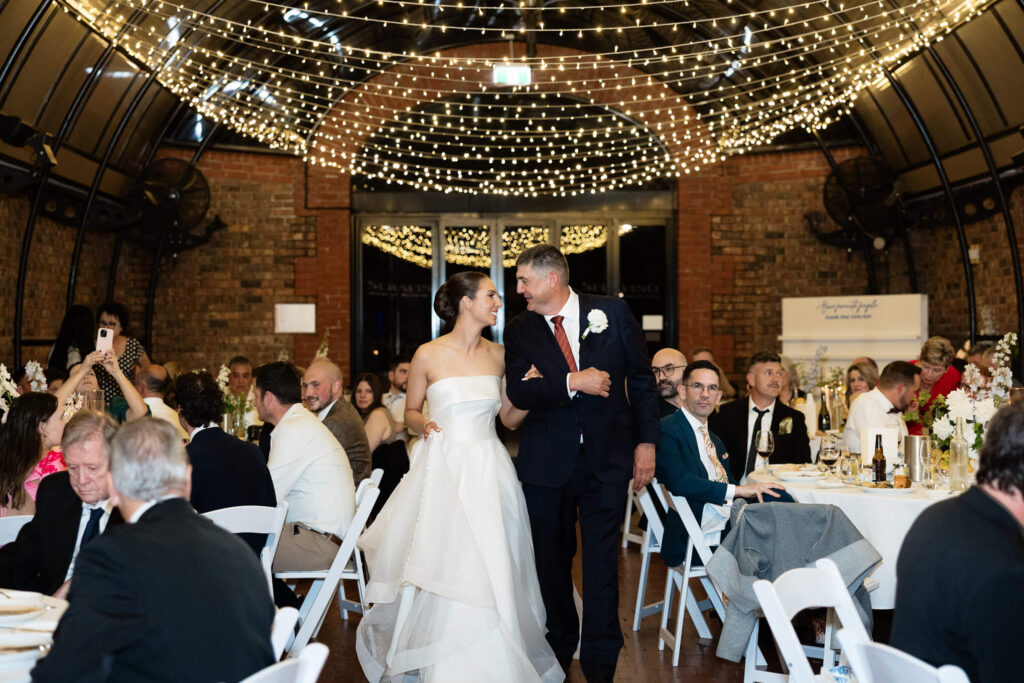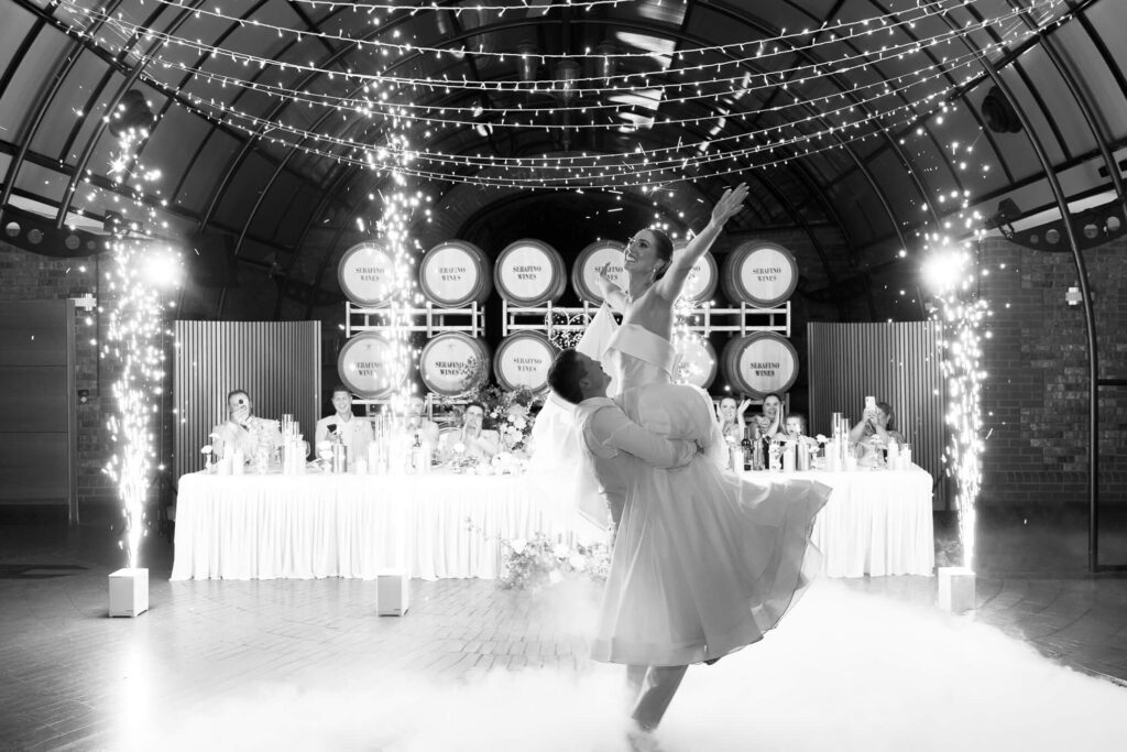 Cocktail hour brought a fun change of pace with a champagne tower, before guests moved inside for the reception. Claudia and Dan entered the room with indoor fireworks, followed by a father-daughter dance. Their bridal waltz featured dry ice and indoor fireworks, creating a standout scene on the dancefloor.