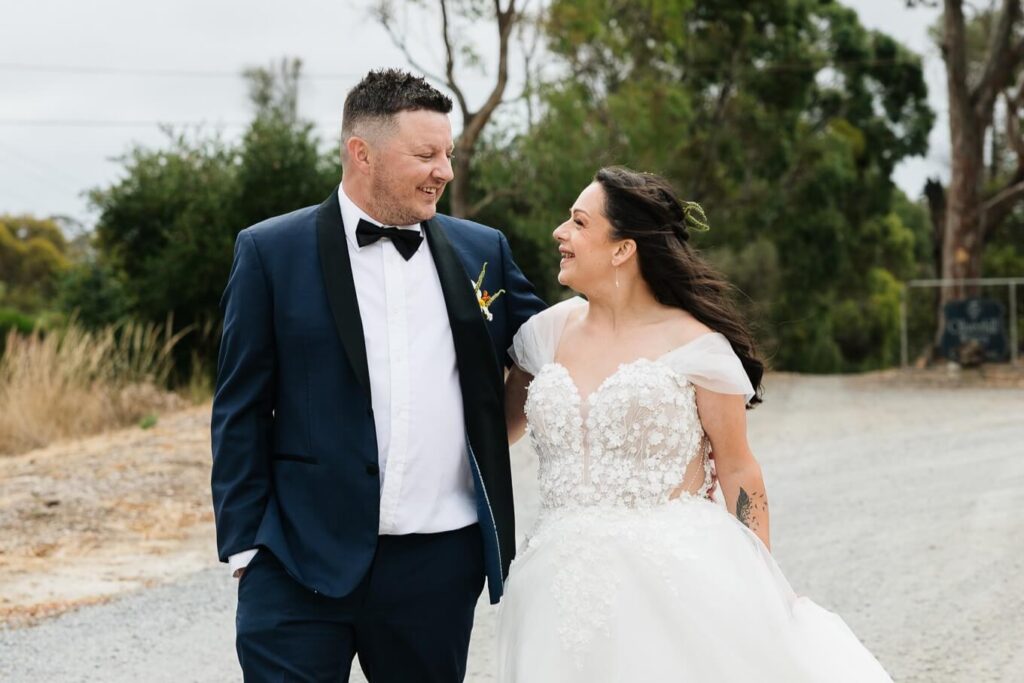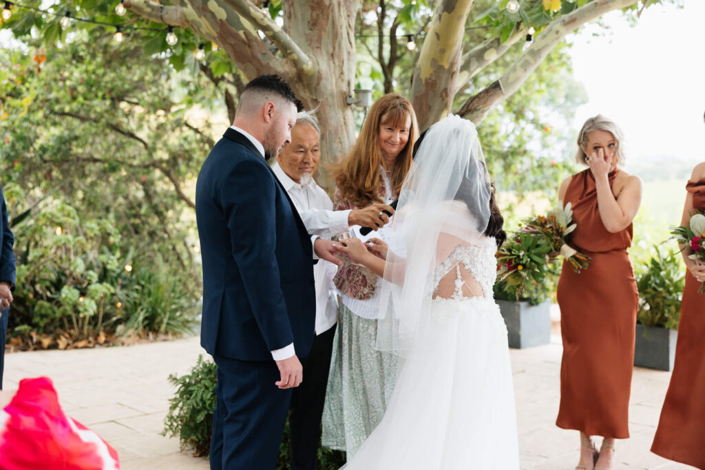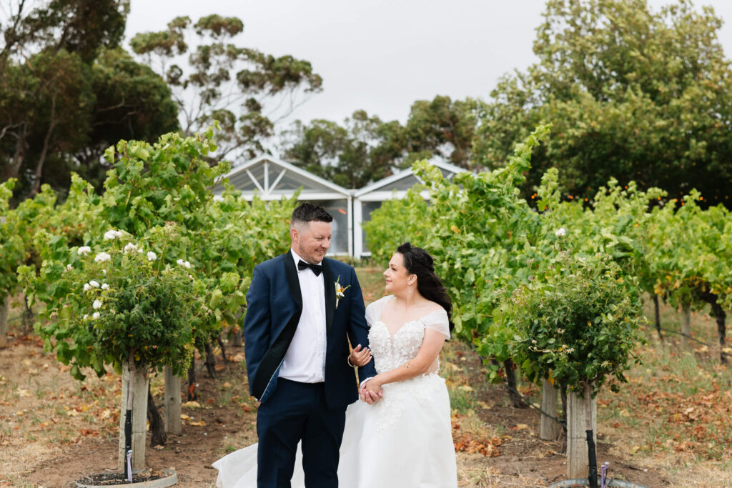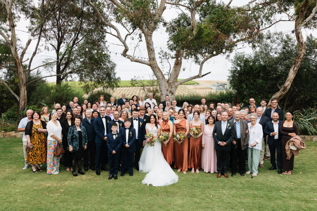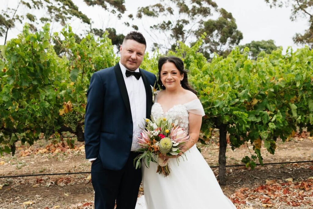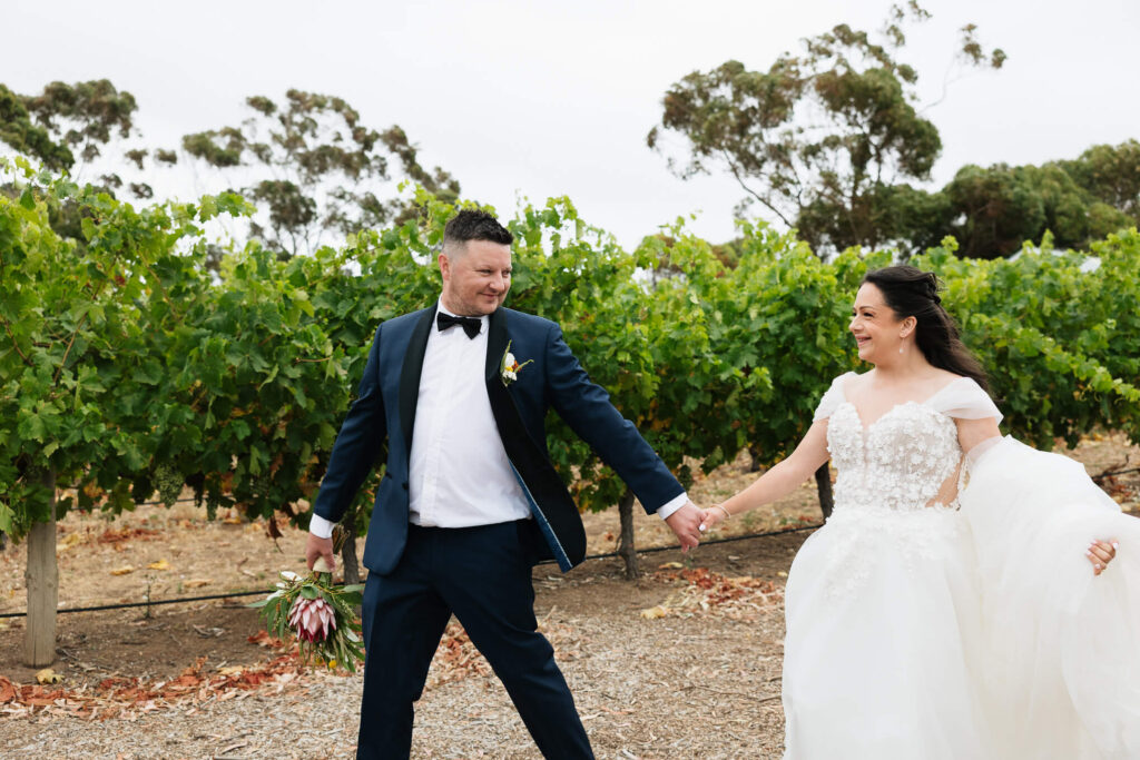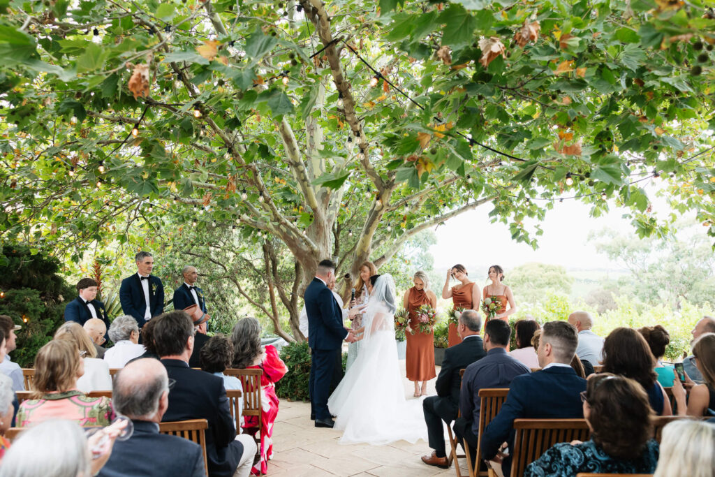 Steph and Lachie celebrated their wedding at Beach Road Wines, where their ceremony took place surrounded by close family and friends. The vineyard landscape provided a calm and beautiful backdrop as the wedding party and bride walked down the aisle, and the couple exchanged their vows under a big tree.