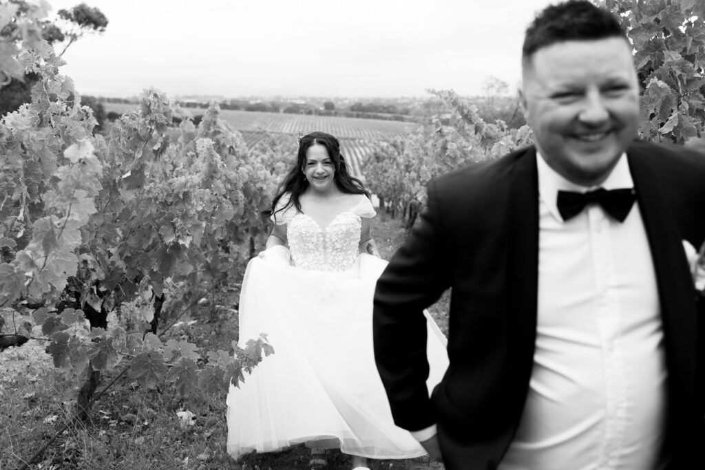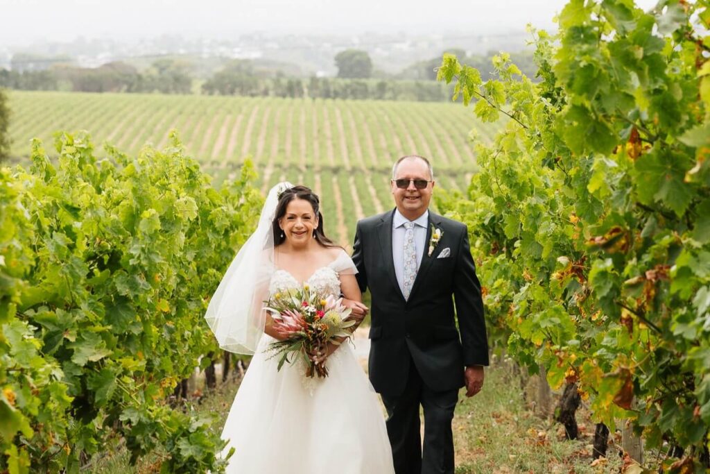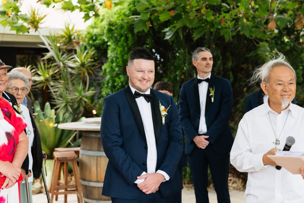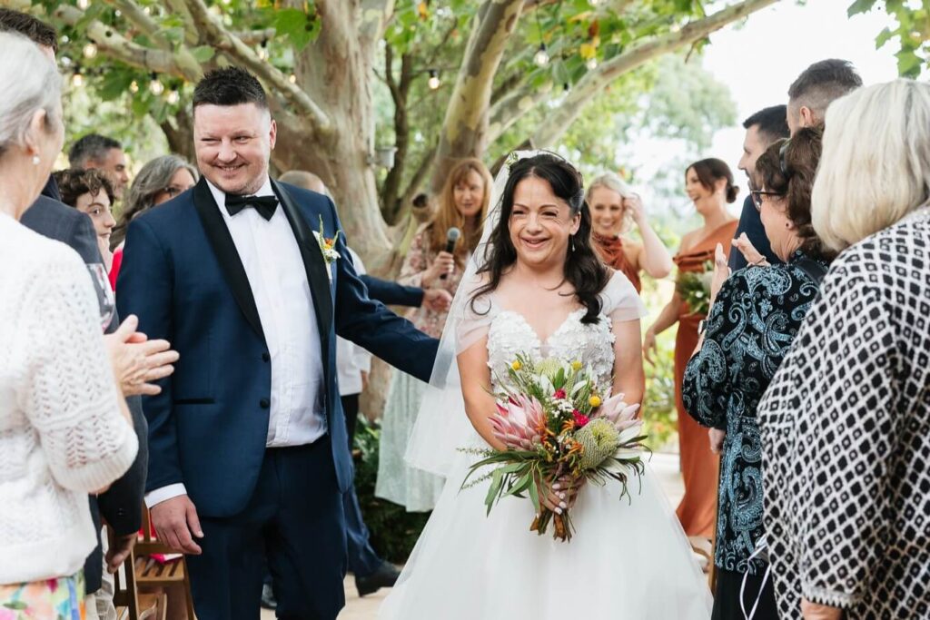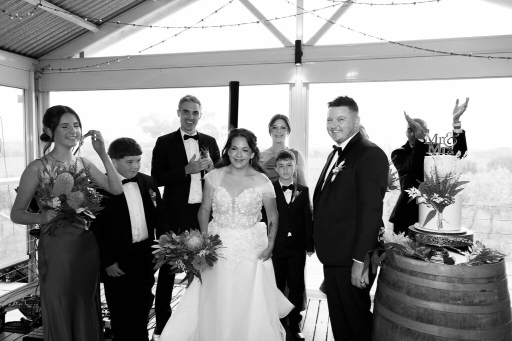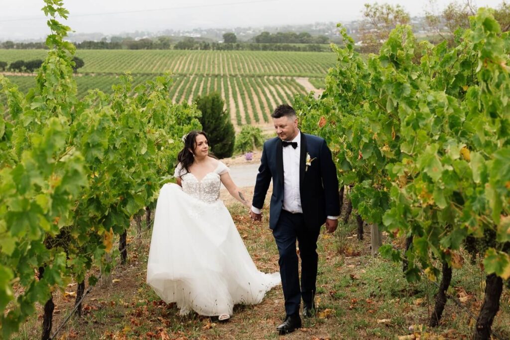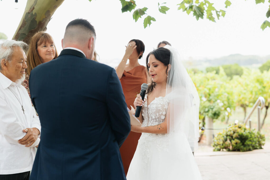 Steph and Lachie celebrated their wedding at Beach Road Wines, where their ceremony took place surrounded by close family and friends. The vineyard landscape provided a calm and beautiful backdrop as the wedding party and bride walked down the aisle, and the couple exchanged their vows under a big tree.