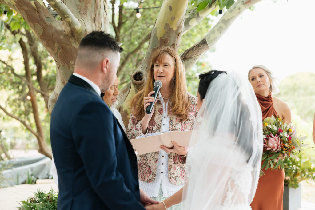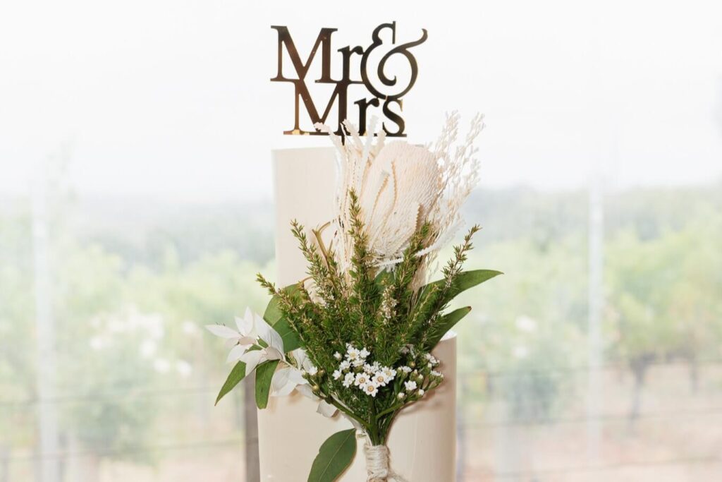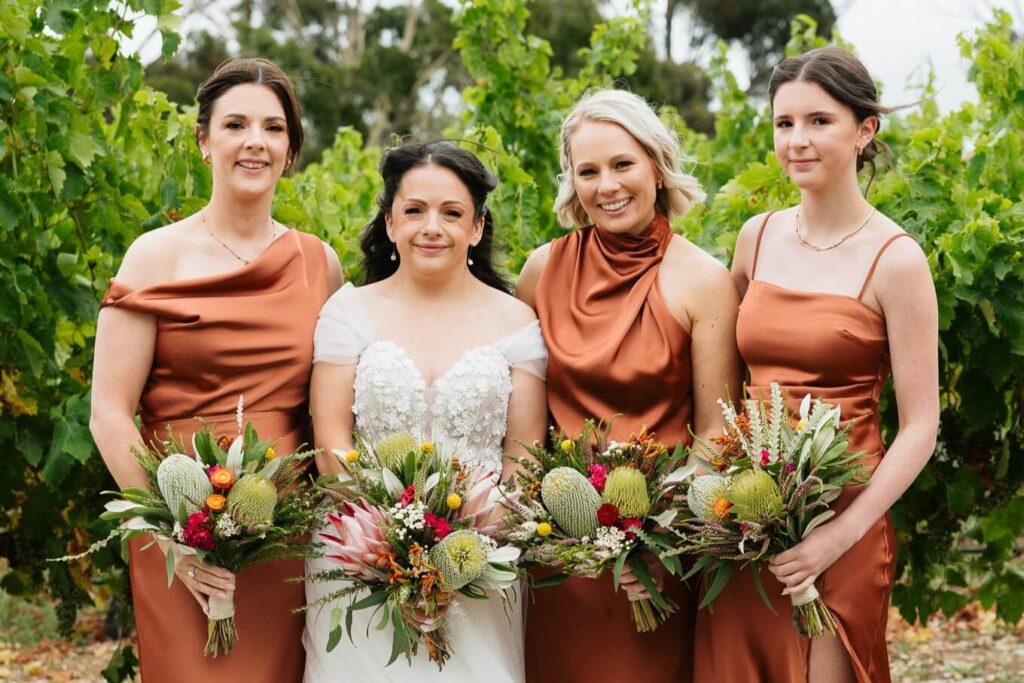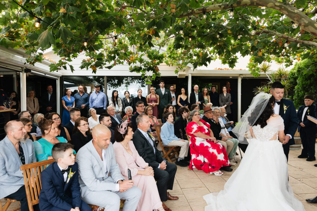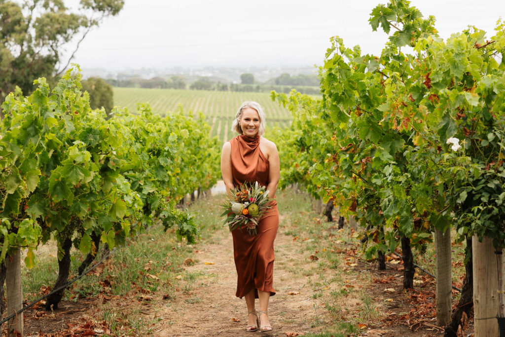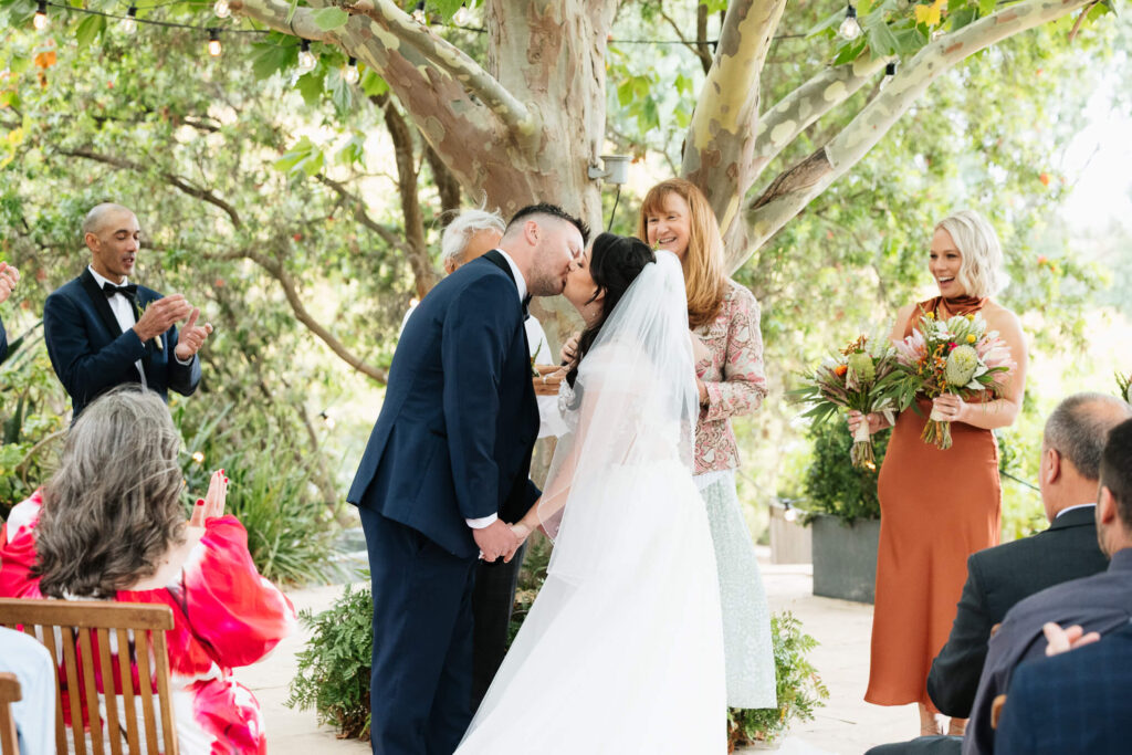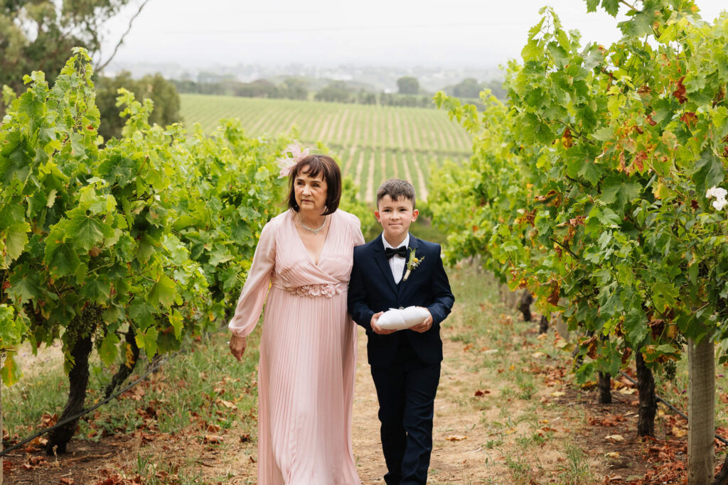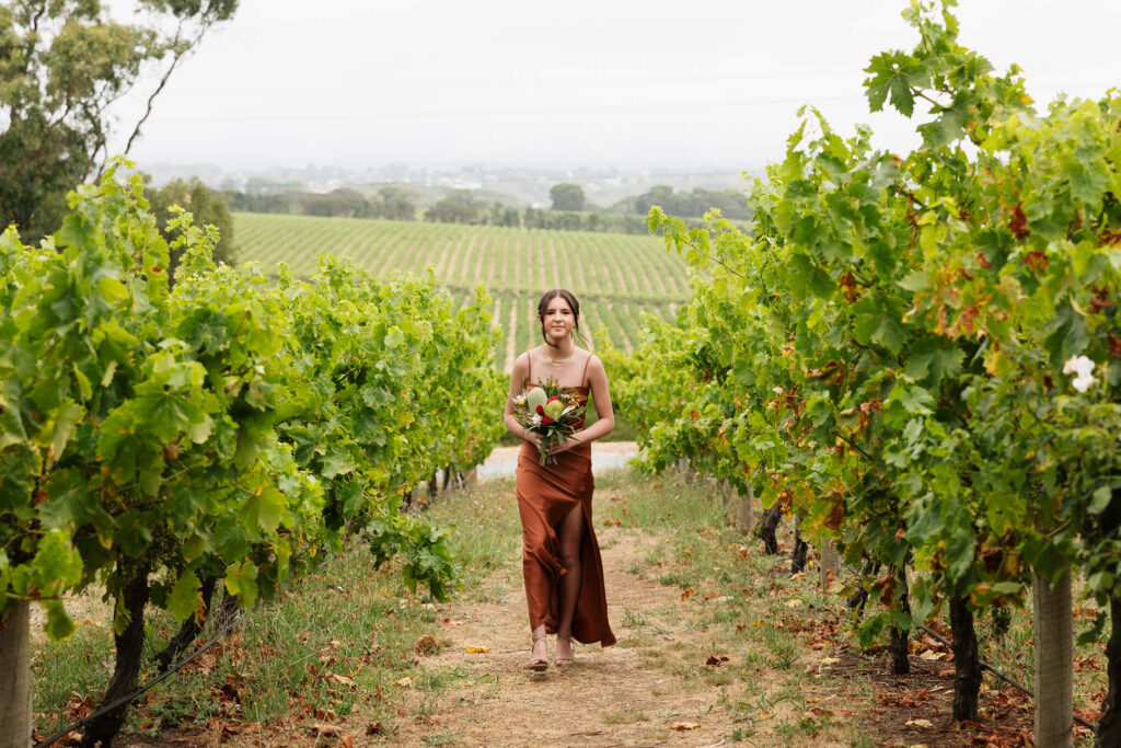 Steph and Lachie celebrated their wedding at Beach Road Wines, where their ceremony took place surrounded by close family and friends. The vineyard landscape provided a calm and beautiful backdrop as the wedding party and bride walked down the aisle, and the couple exchanged their vows under a big tree.