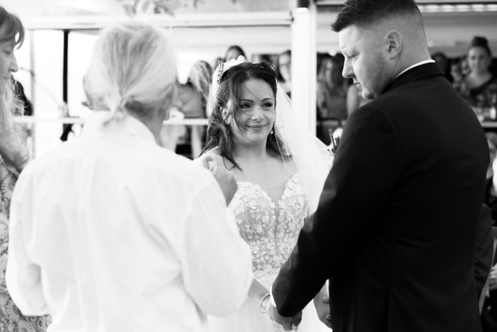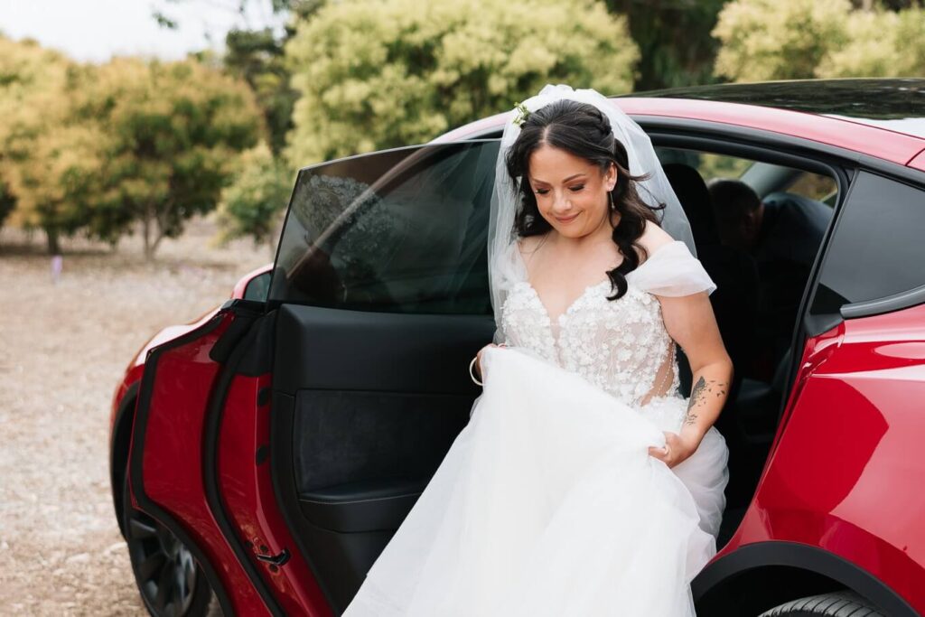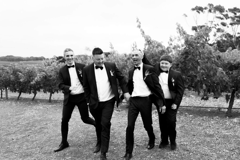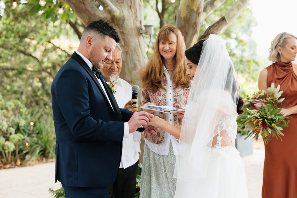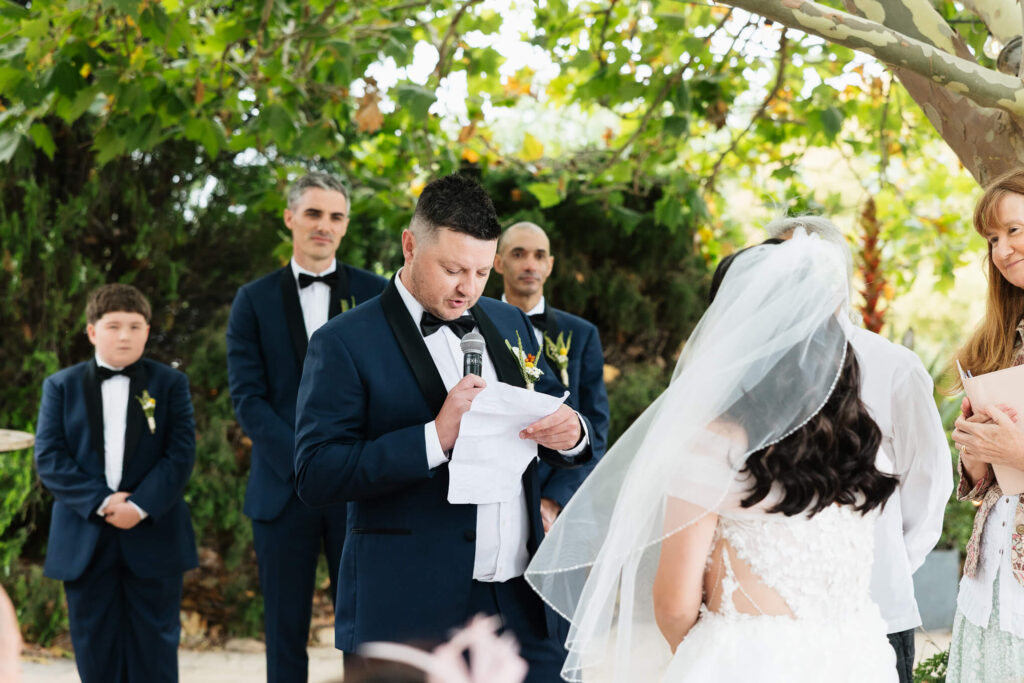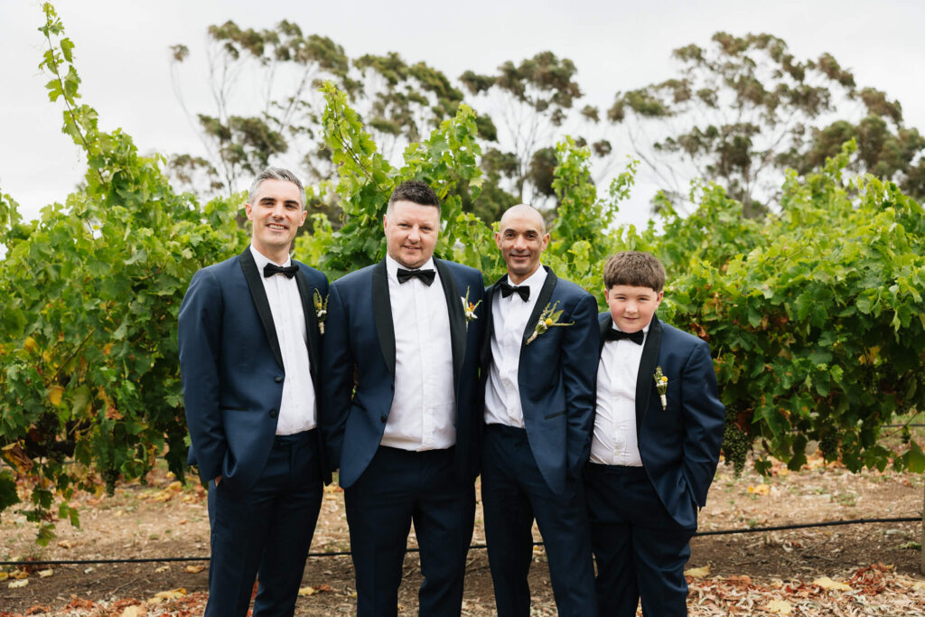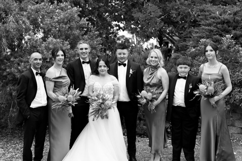 Steph and Lachie celebrated their wedding at Beach Road Wines, where their ceremony took place surrounded by close family and friends. The vineyard landscape provided a calm and beautiful backdrop as the wedding party and bride walked down the aisle, and the couple exchanged their vows under a big tree.