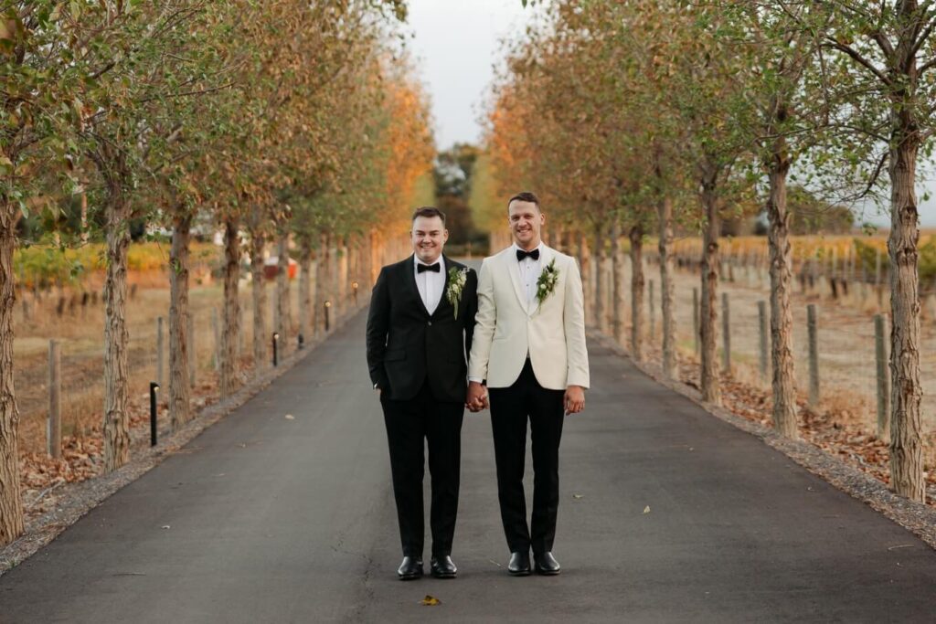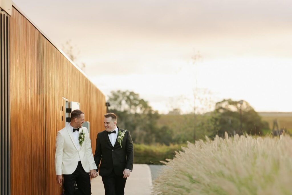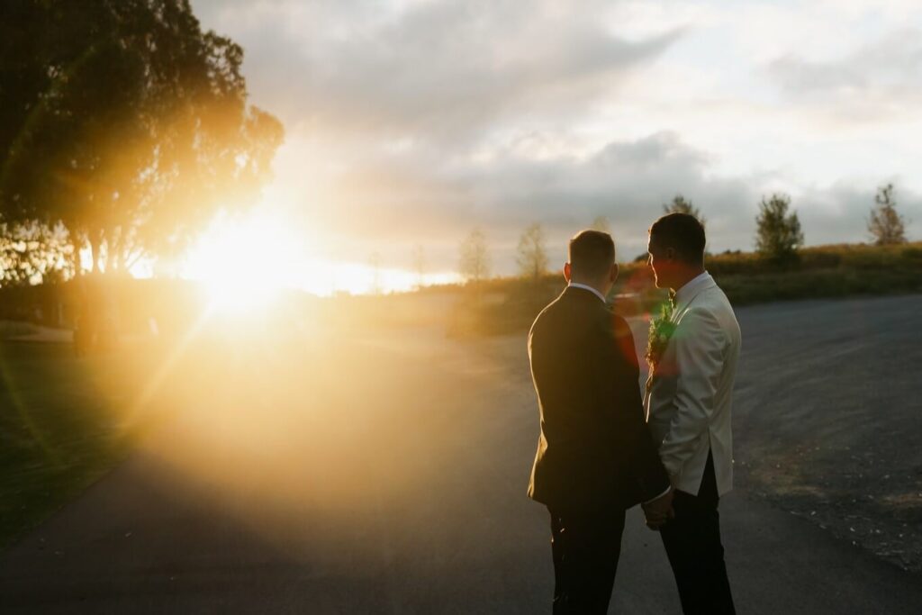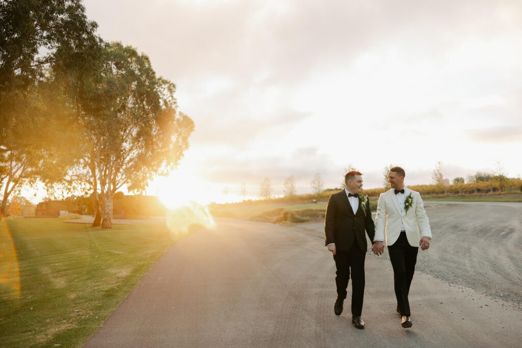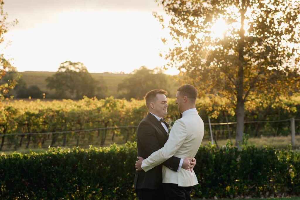 Walking down the aisle side by side, Travis and Nick created a moment that was both heartfelt and unique. During the ceremony, a rainbow appeared in the sky – a magical touch that made the day even more unforgettable. Later, as the sun dipped low, golden skies glowed across the vineyards, creating the perfect backdrop for their couple portraits.