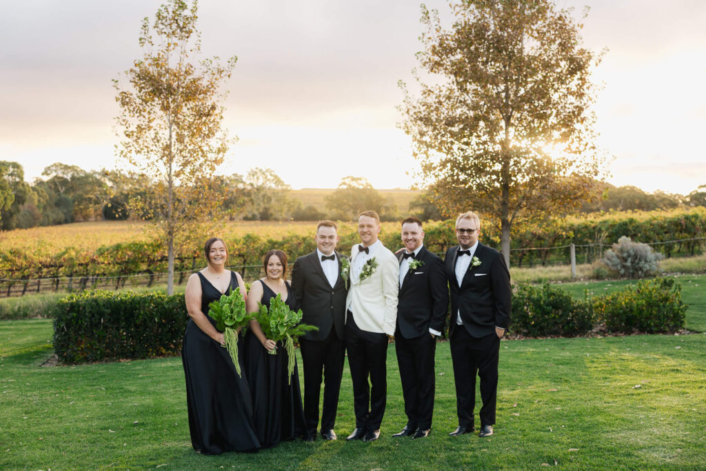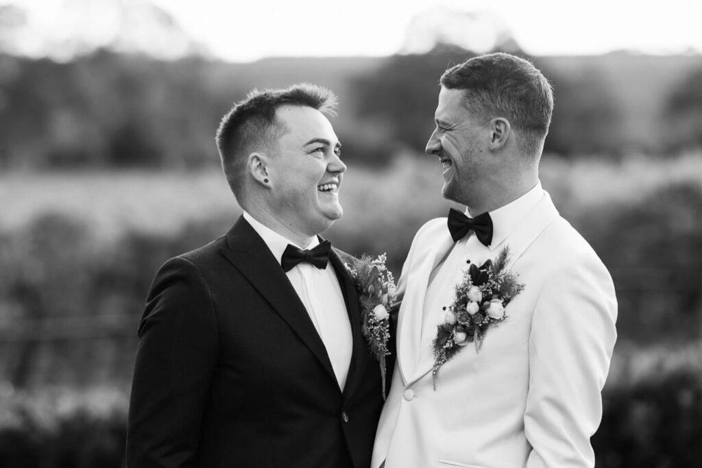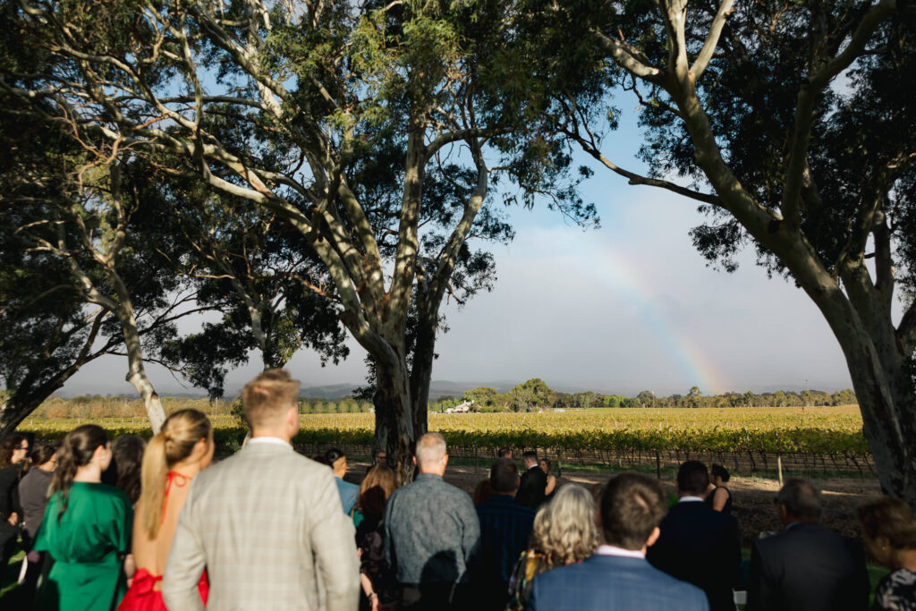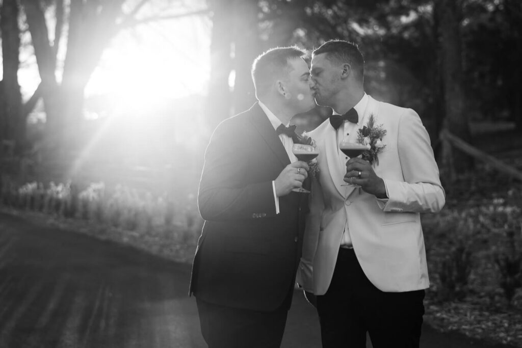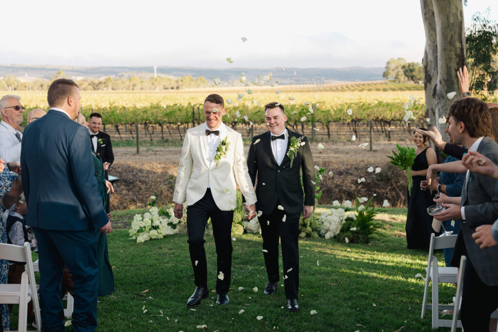 Walking down the aisle side by side, Travis and Nick created a moment that was both heartfelt and unique. During the ceremony, a rainbow appeared in the sky – a magical touch that made the day even more unforgettable. Later, as the sun dipped low, golden skies glowed across the vineyards, creating the perfect backdrop for their couple portraits.